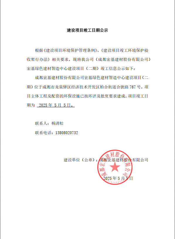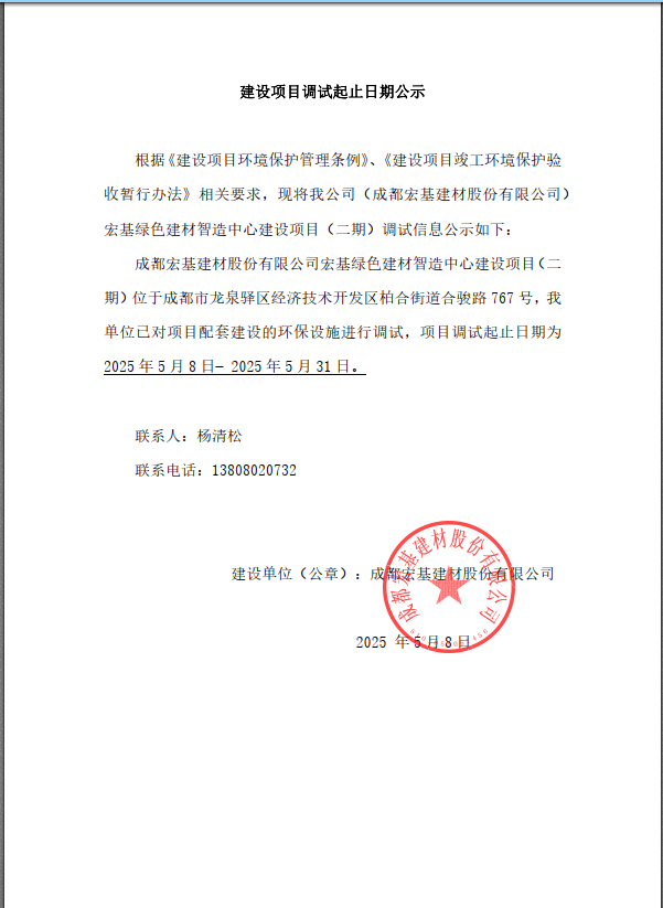 热烈祝贺公司绿色建材智造中心(二期)建设项目环保设施竣工,现进行建设项目竣工日期公示及建设项目调试起止日期公示。