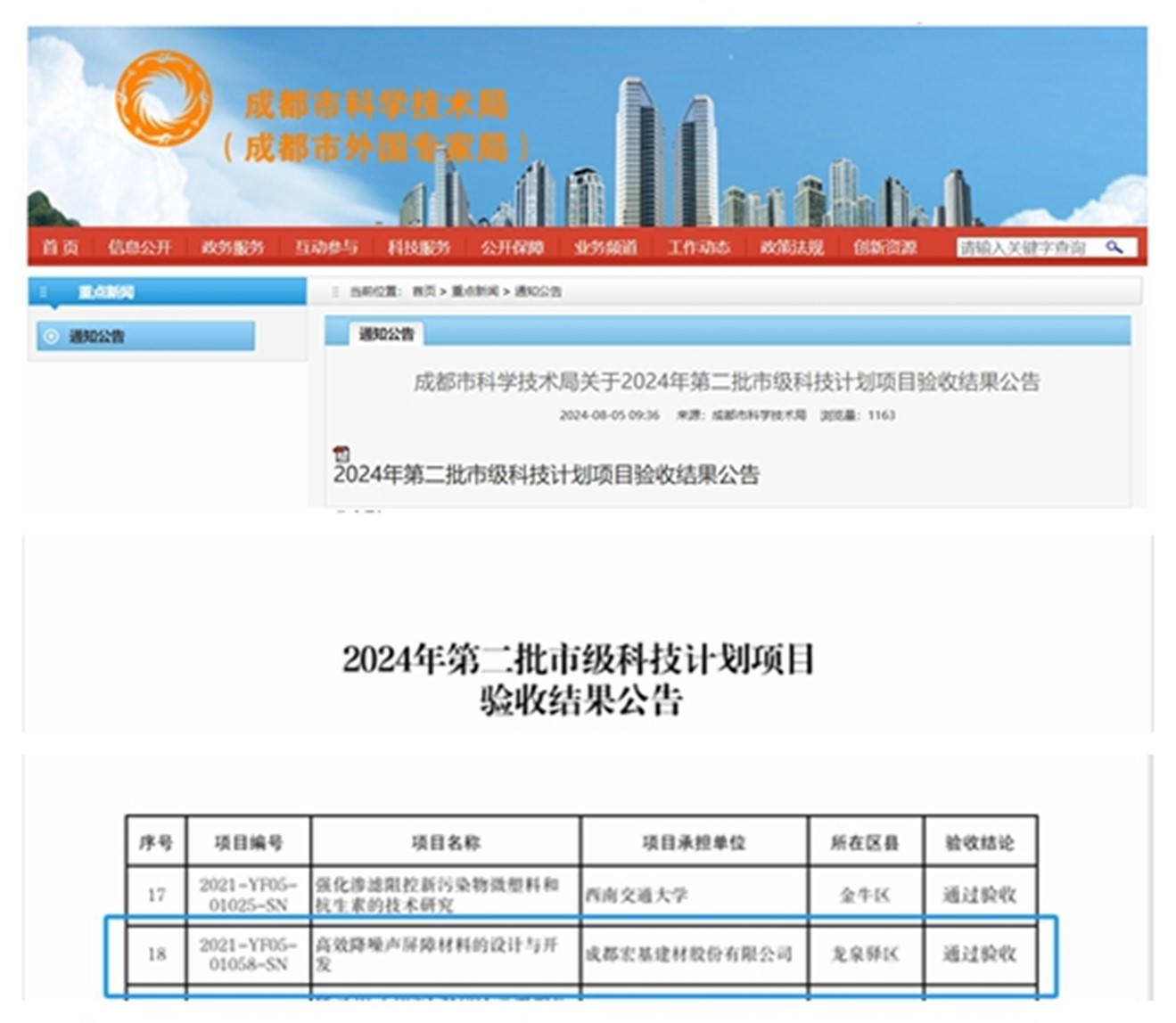8月5日,成都市科学技术局发布2024年第二批市级科技计划项目验收结果公告,由成都宏基申报的《高效降噪声屏障材料的设计与开发》项目,顺利通过验收。